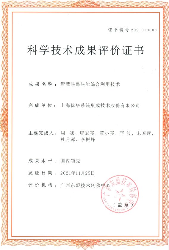 智慧熱島技術(shù)2021年入圍工信部國家工業(yè)節(jié)能技術(shù)推廣目錄。同年廣西科技廳廣西東盟技術(shù)轉(zhuǎn)移中心組織有關(guān)專家對“智慧熱島熱能綜合利用技術(shù)”科技成果進(jìn)行了評價,評價結(jié)論為該技術(shù)達(dá)到了同類研究國內(nèi)行業(yè)領(lǐng)先水平。